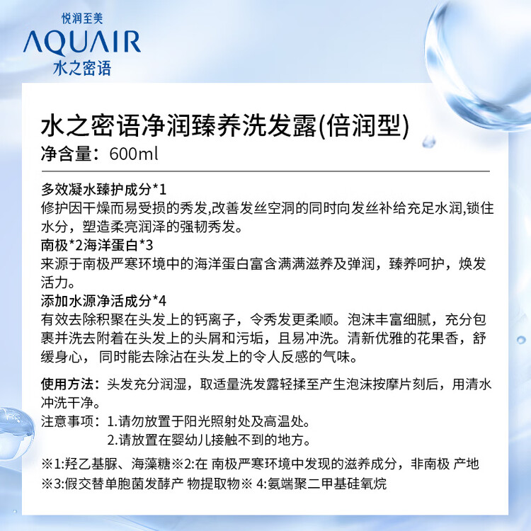 水之密语(AQUAIR)净润臻养(倍润型)洗发水600ml+护发素600ml修护滋养洗护套装自营